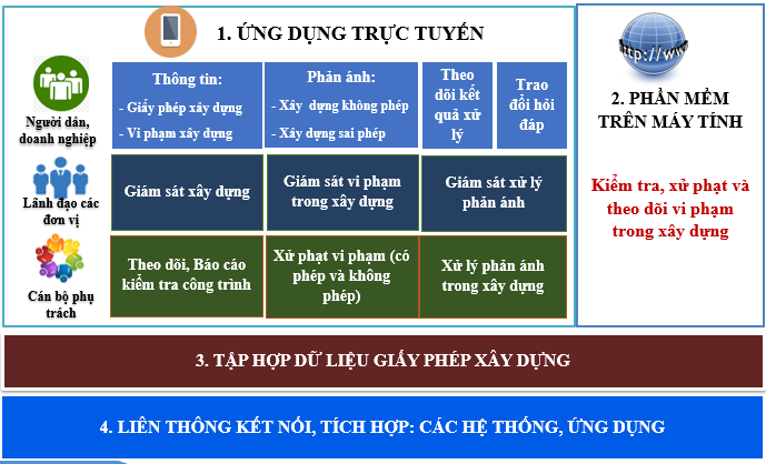 Liên thông kết nối, chia sẻ thông tin: Hệ thống thông tin được xây dựng trên nền tảng công nghệ GIS có tích hợp nhiều tính năng phần mềm tác nghiệp, ISO điện tử, Văn phòng ĐKQSD đất, web điều hành của lãnh đạo, ... Liên thông toàn diện theo chiều dọc lẫn chiều ngang từ quận đến phường, nhằm khắc phục triệt để các hạn chế trong việc quản lý điều hành cũng như tình trạng chậm trễ hồ sơ trong lĩnh vực đô thị.