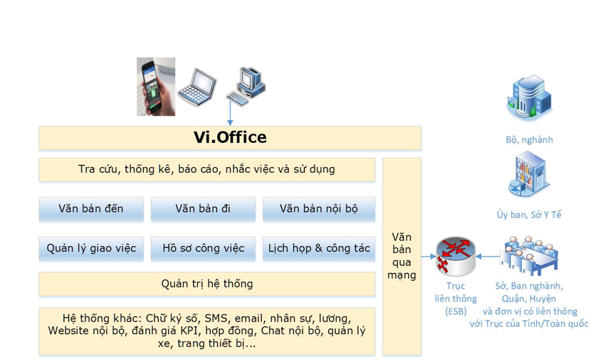 Bên cạnh đó, Hệ thống Vi.Office với sự đáp ứng hoàn toàn các quy chuẩn của hệ thống quản lý thông tin của Chính phủ, có thể thực hiện kết nối liên thông với trục liên thông ESB của tỉnh/thành phố.